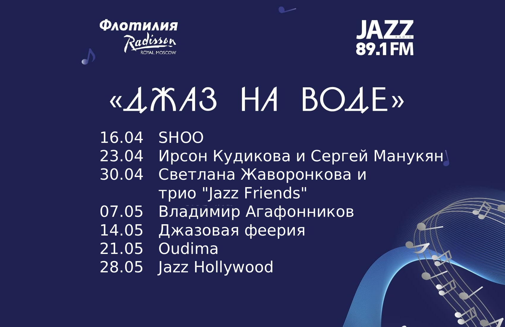 Flotilla Radisson Royal and JAZZ 89.1 FM Radio invite Muscovites and guests of the capital on a unique journey – "Jazz on the Water". Every Thursday we are waiting for you at the "Hotel Ukraina" pier to go together towards the warmest and most romantic memories.